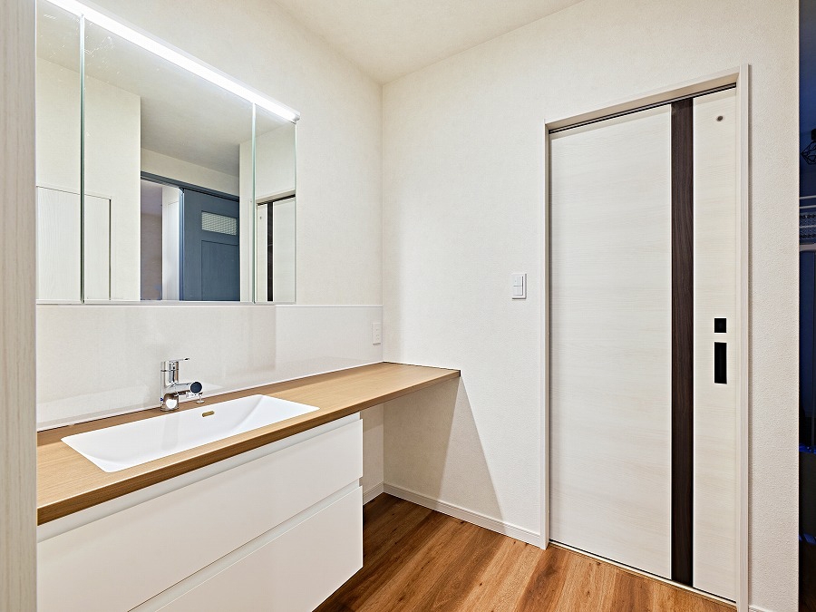 広々とした洗面カウンターに、メイクや身支度ができるスペースをプラス。収納も充実し、毎日の準備が快適になる洗面室。