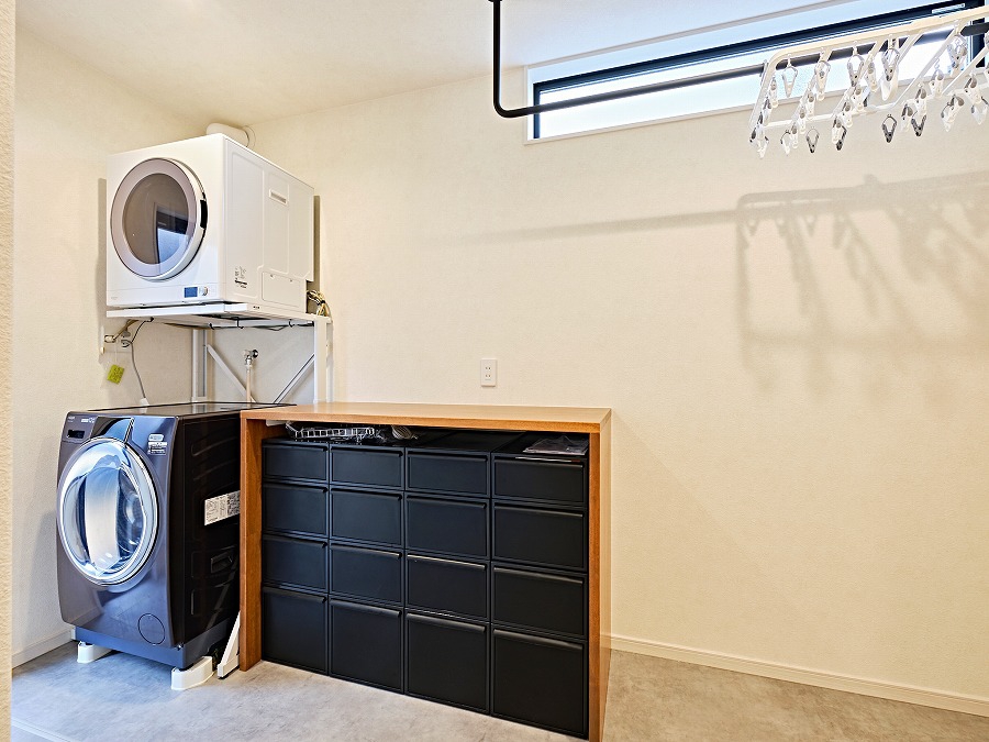 洗面室横に配置した洗う・干す・たたむ・片付けるを一か所で叶えるランドリールーム。