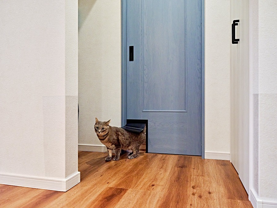 猫が自由に移動してもいい部屋にはペットのれんドアを設け、ストレスなく移動できる工夫を。帰宅時には猫が玄関でお出迎えしてくれます。