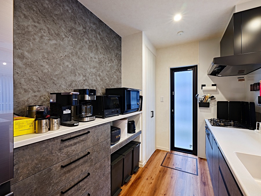 帰宅後すぐに洗面所で手を洗い、キッチンに荷物を置けるスムーズな動線を実現。広々としたキッチンは夫婦で並んで作業しても快適で、ダイニング側のコンセントは調理やスマホ充電に便利。収納も充実し、5帖のウォークインクローゼットで洋服をきれいに収納できる暮らしやすさを叶えました。