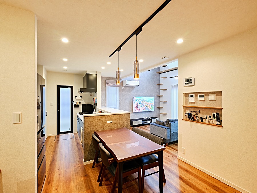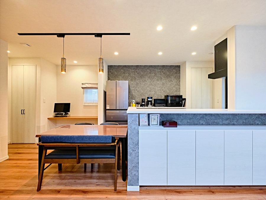 横並びのダイニングで家事動線を短く使いやすさを追求。ダイニングの照明が空間に華やぎを与えています。