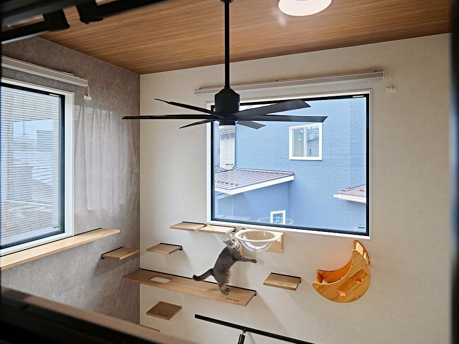 猫がストレスなく過ごせるよう、外が見える窓やキャットウォークを設計。LDKにはネコドアを採用し、帰宅時には玄関まで迎えてくれるのが癒しです。吹抜けに設けたキャットウォークは、猫の負担のない高さや回遊動線を考え抜いた設計で、愛猫がのびのび遊べるお気に入りの場所になっています。家事もスムーズに!考え抜かれた快適導線
