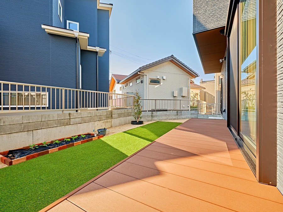 リビングからつながる広々としたウッドデッキ。人工芝の緑がやさしく彩り、猫も家族も心地よく過ごせる空間。