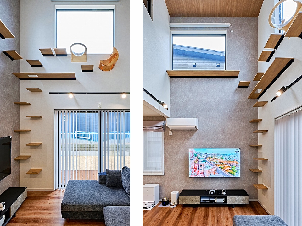 大きな窓から光が降り注ぐ吹抜け空間に、猫が自由に遊べるキャットウォークを設置。家族みんなが快適に過ごせるLDK。