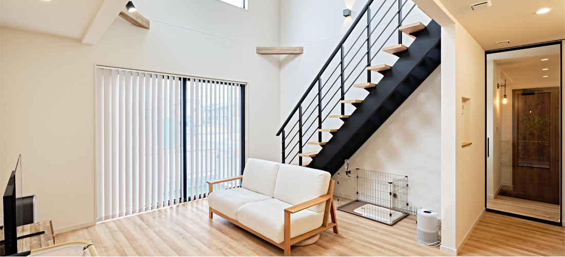 吹抜け空間を最大限に活かしたスケルトン階段は、リビングに開放感をもたらしながら、視線が抜ける軽やかなデザインが魅力。