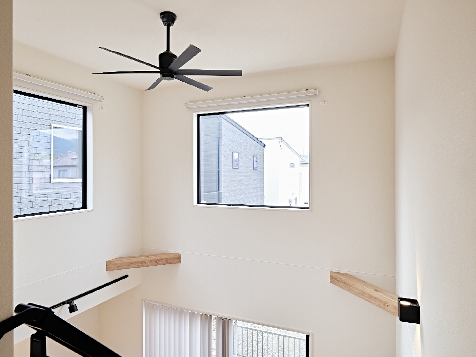 大きな窓から光が降りそそぐ吹抜のLDK。黒のシーリングファンが空間を引き締め、機能性とデザイン性を兼ね備えた空間に。