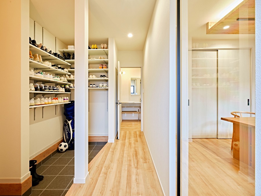 玄関横の大容量シューズクロークは出来るだけ壁をなくし、開放感と使いやすさを追求。洗面室・ファミリークローゼットへは直行できる便利な動線設計。