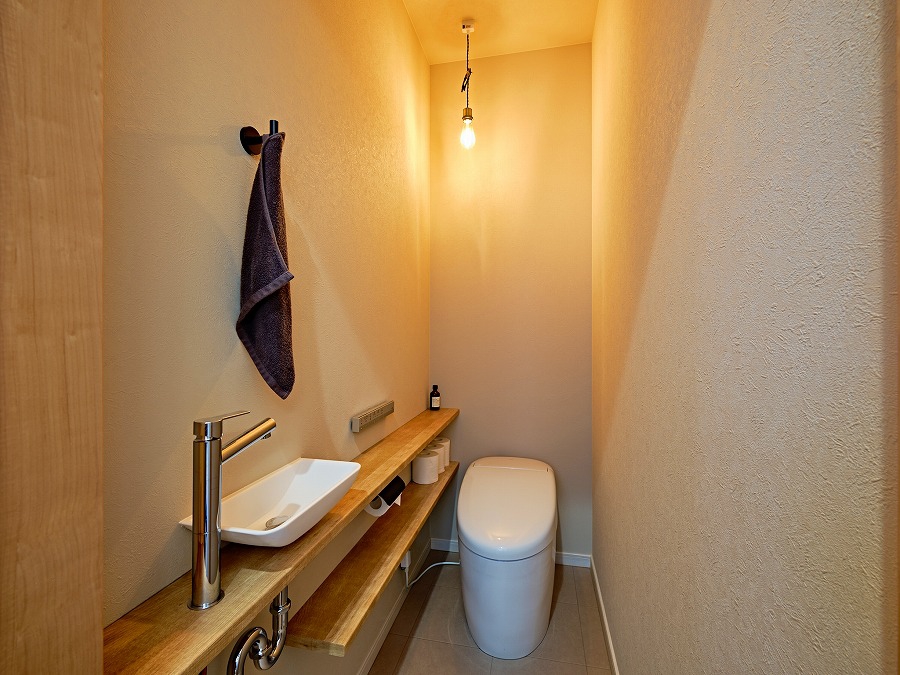 タンクレストイレで空間をすっきりとした印象に。 木の質感を生かした造作カウンターとペンダントライトが、あたたかみのある雰囲気を演出。