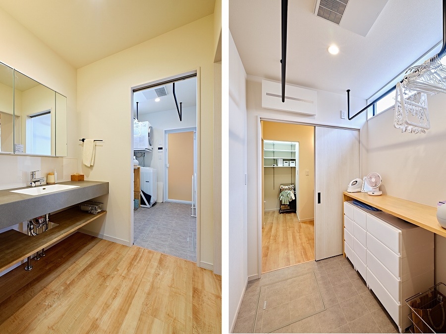 シンプルで洗練されたアイカの造作洗面台と、実用性の高いランドリールーム。美しさと使いやすさを両立させたサニタリースペース。