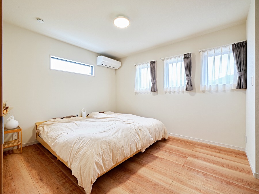 メープルの優しい木目の床と、横並びの小窓から差し込む柔らかな光。ナチュラルな心地よさに包まれる寝室。