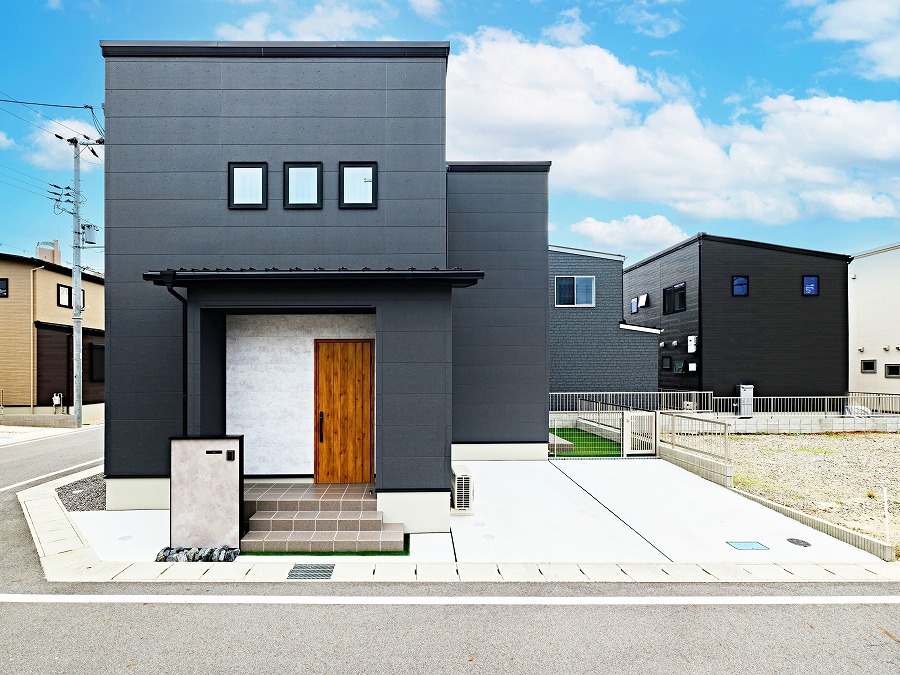 黒を基調とした外観に、KMEW『フィエルテ』のチタンコンクリート柄をアクセントとして採用。正面のデザイン窓の配置まで拘ったスタイリッシュな佇まいです。