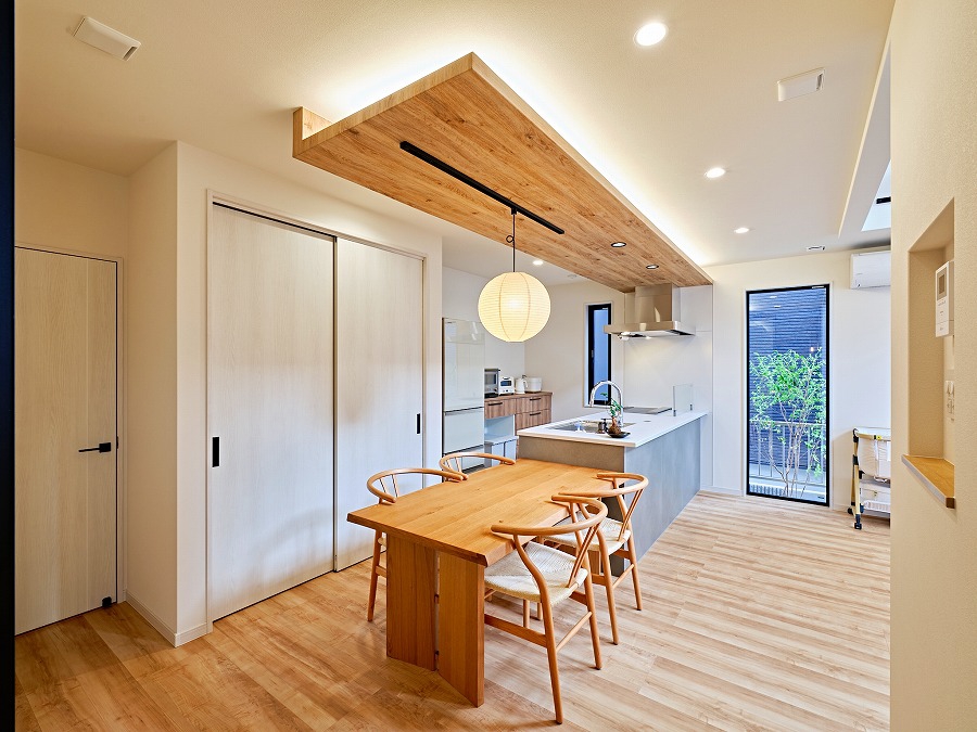 やわらかい丸型のペンダントライトが、木目の天井と優しく調和したジャパンディスタイルのLDK。