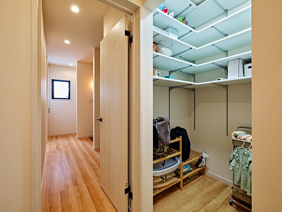 キッチン背面には、食材や日用品をすっきり収納できるパントリーを配置。扉付きで生活感を隠せるのもポイント。