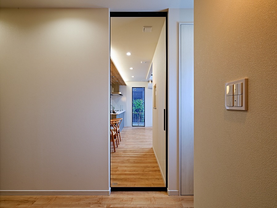 玄関正面のLDKの建具には人気のラフィスの引戸を採用。玄関からLDKへ視線が抜け、奥の窓からは四季の移ろいを感じられる心地よい住まい。