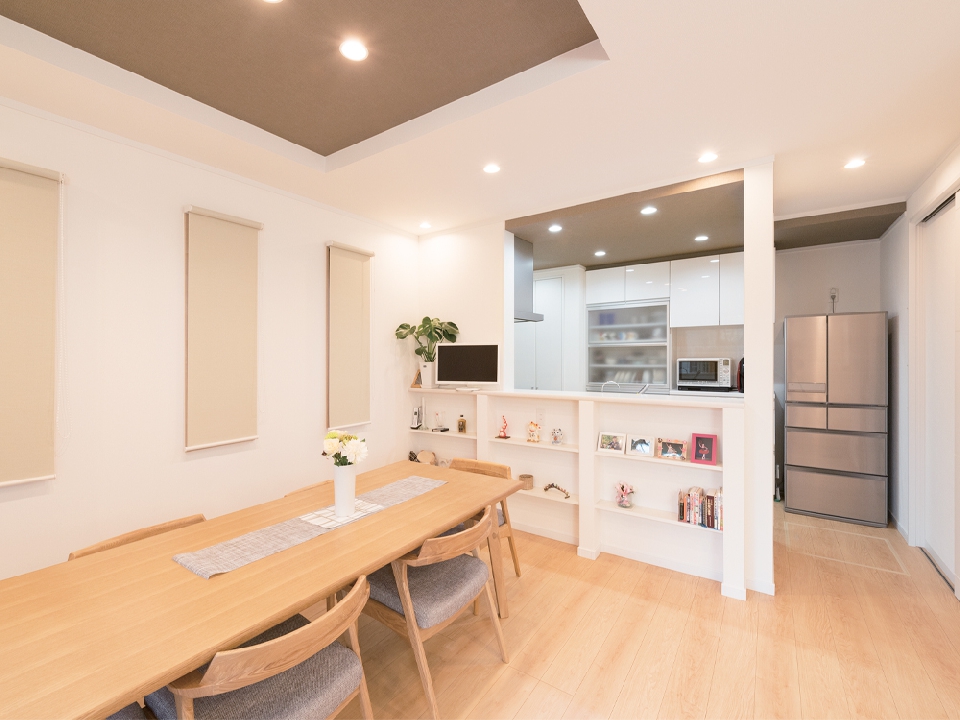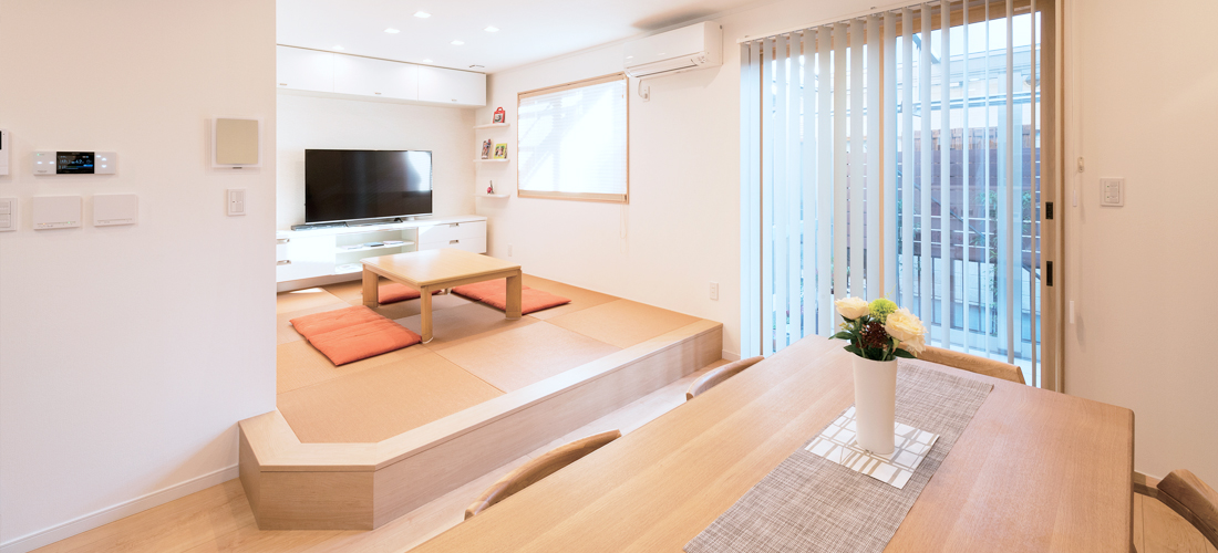 設計では、家族の団らん空間、収納、動線、個人の個性を生かした部屋づくり等を考えたプランニングをされました。今後のお子様の独立などのライフスタイルの変化も視野に入れた間取りや、環境や健康に配慮した高い住宅性能や機能などのこだわりが実現しました。リビングは、一部が小上がりの畳スペースになっており、ご入居後はご主人よりもお子様達のお気に入りの場所になっているそうです。また、対面キッチンからは、広いリビングを見渡すことができます。窓サッシのナチュラルな木目枠と、天井の貼り別けデザインがアクセントとなっています。キッチン脇の壁には、臭気を湿気を調節してくれる機能とデザインを両立させたエコカラットをアクセントに貼りました。キッチンは使いやすく収納も充実させました。スッキリする室内を維持する為、ダイニングカウンターにも収納棚を設けました。南側の窓にはテラスがあり、窓付近には部屋干器具を天井に埋め込みました。家事がしやすくなる嬉しい設備です。