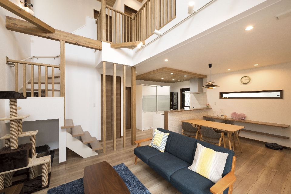 大胆な吹き抜けがとても開放的なリビングを演出してくれています。ネコちゃんも大喜びですね。