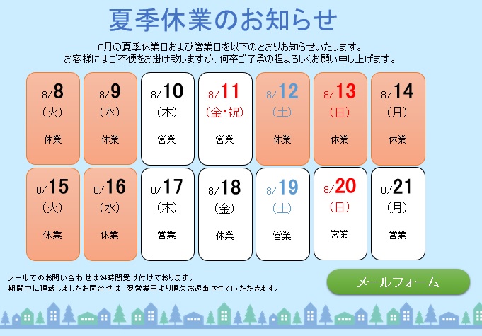 夏季休業のお知らせ【8月12日(土)~16日(水)】