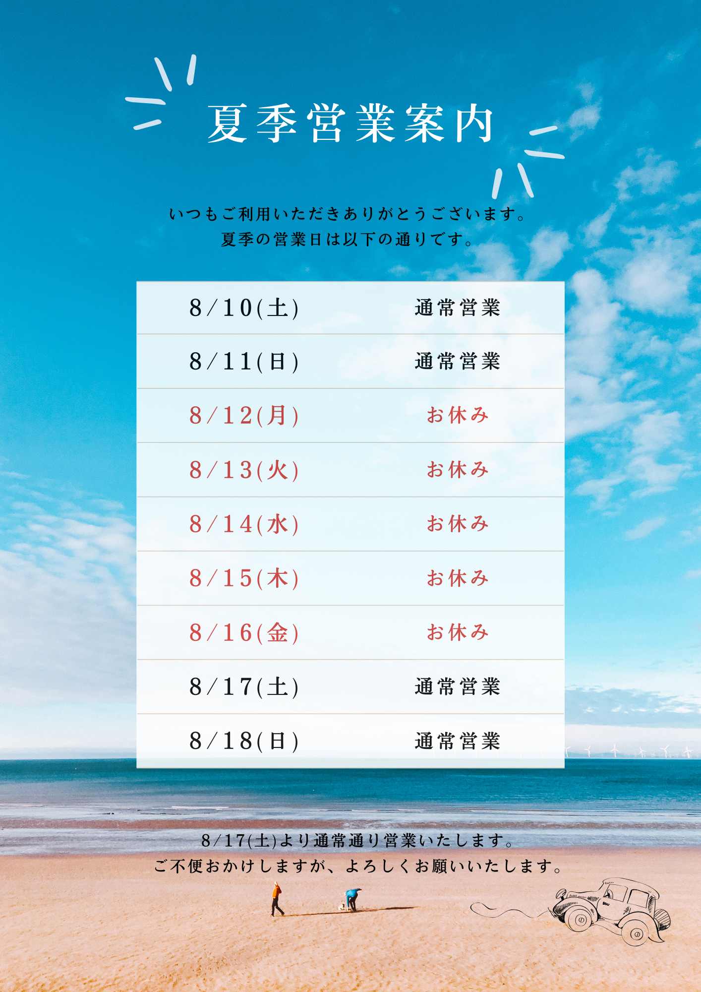 【夏季休業のお知らせ】2024年8月12日(月・祝)~16(金)