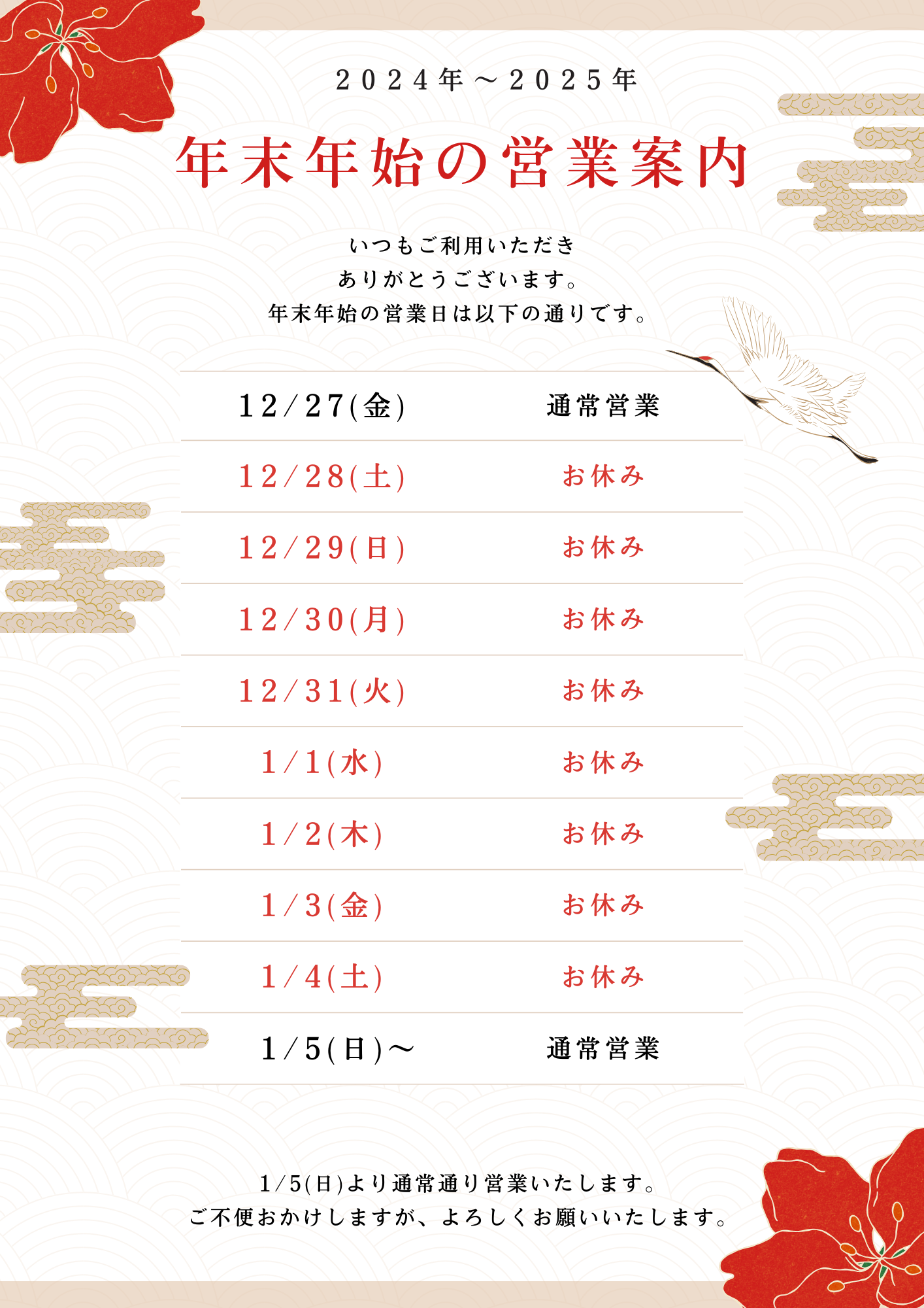 年末年始休業のお知らせ【12月28日(土)~1月4日(土)】