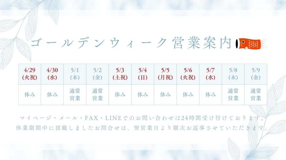 ゴールデンウィークの休業日および営業日を以下のとおりお知らせいたします。