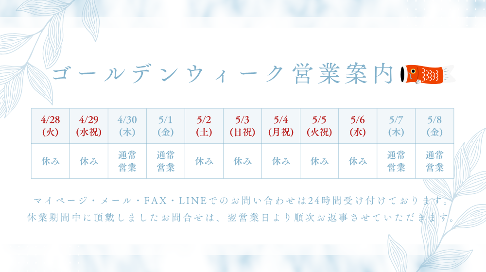 休業期間中に頂戴しましたお問合せは、翌営業日より順次お返事させていただきます。